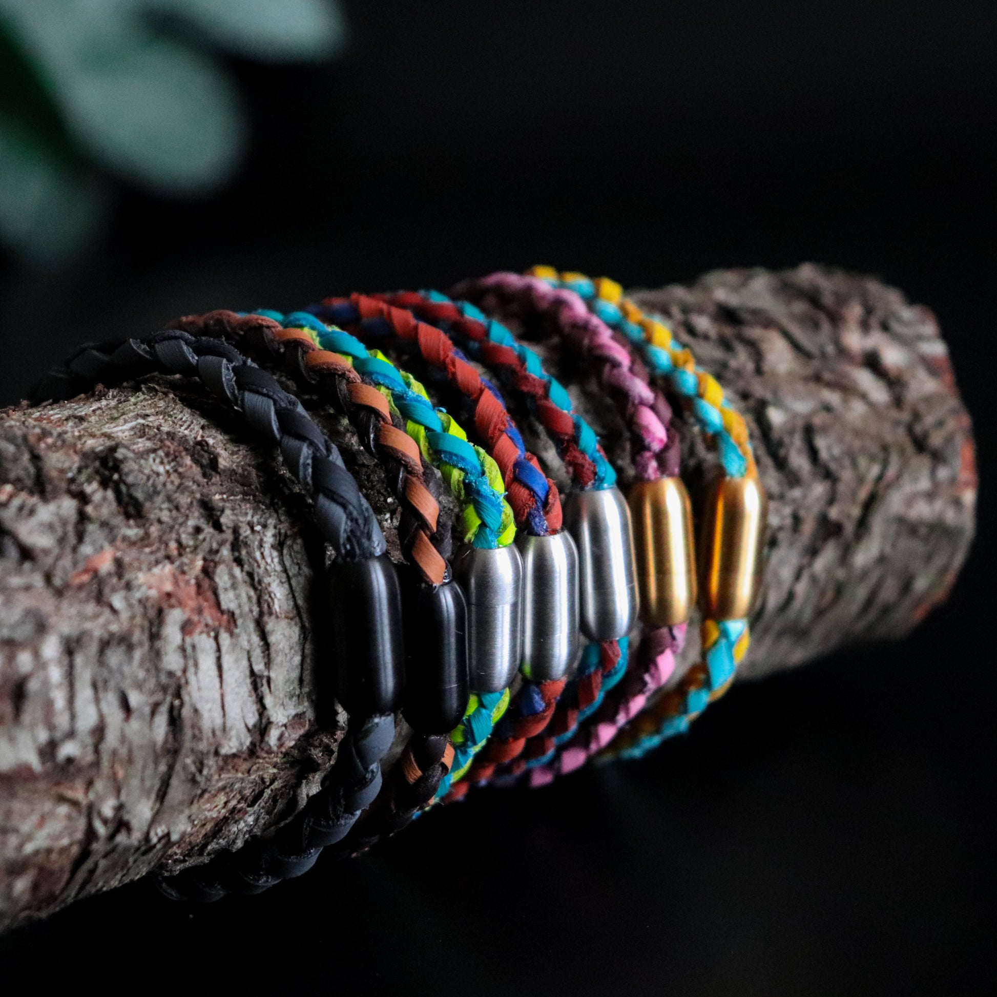 Wähle zwei Farben deiner Wahl, die miteinander verflochten werden. Entscheide dich außerdem für einen Magnetverschluss in Schwarz, Gold, oder Silber.