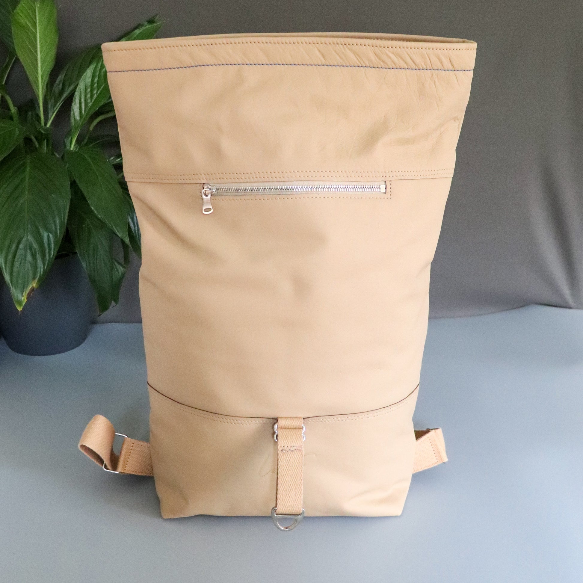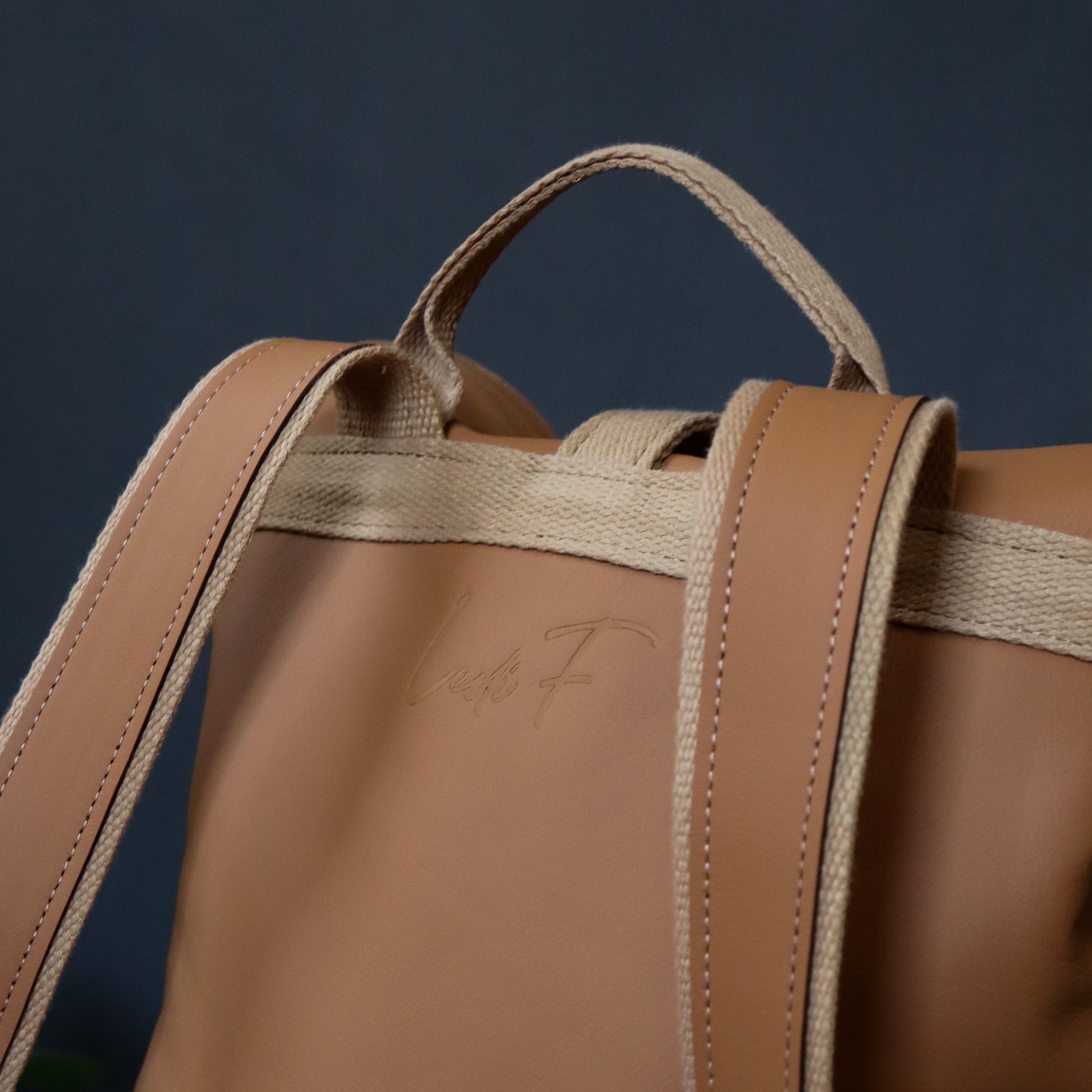 Wähle die Außenfarbe des Leders, die bunte Garnfarbe* sowie die Farbe des Innenfutters und kreiere so dein persönliches Einzelstück. Die Farbe der Träger richtet sich nach der Wahl deiner Außenlederfarbe (z.B. beiges Leder – beiges Gurtband). Füge optional eine Prägung hinzu. Dein Wunschtext wird auf der Vorderseite mittig unterhalb des kleinen Reißverschlussfachs positioniert.
